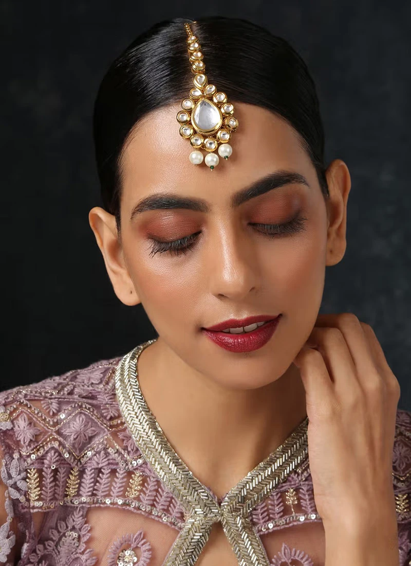 The golden plated mangtikka comes with kundan studded on it and white beads dangling on the mangtikka.