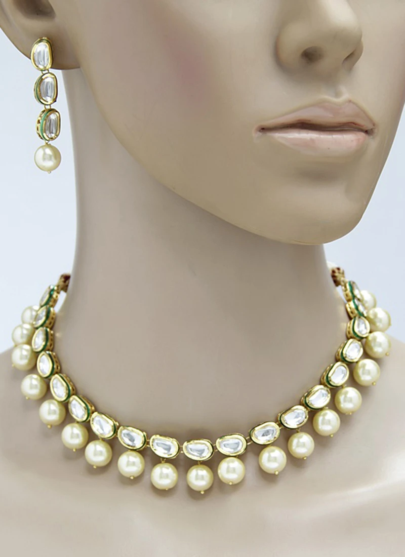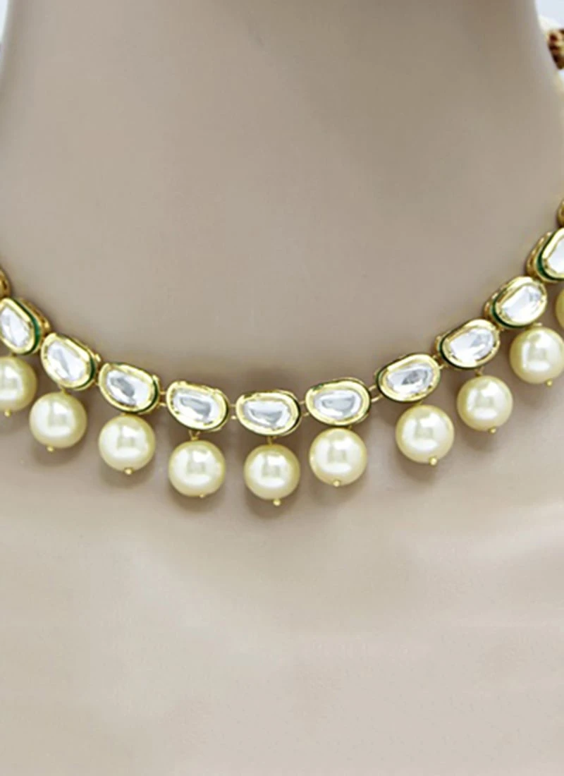 Gold plated necklace set with decorative kundan stones studed on the jewellery also has beads strung on it .Comes with a pair of earrings.