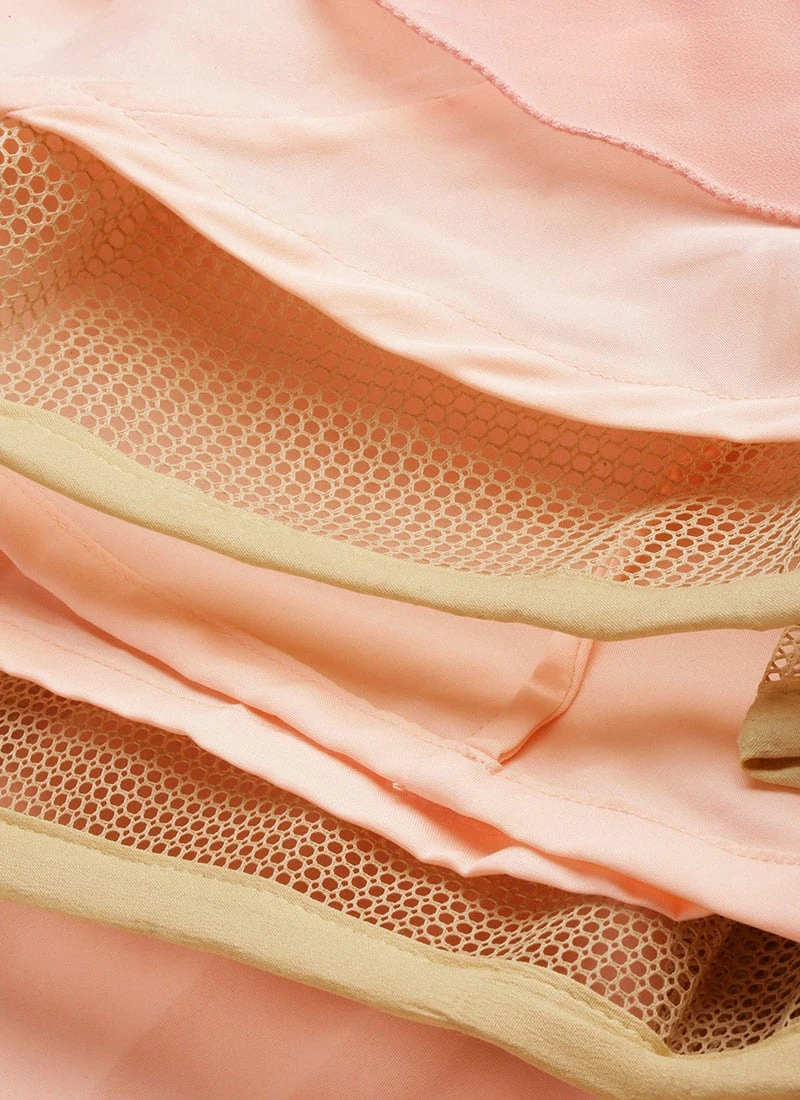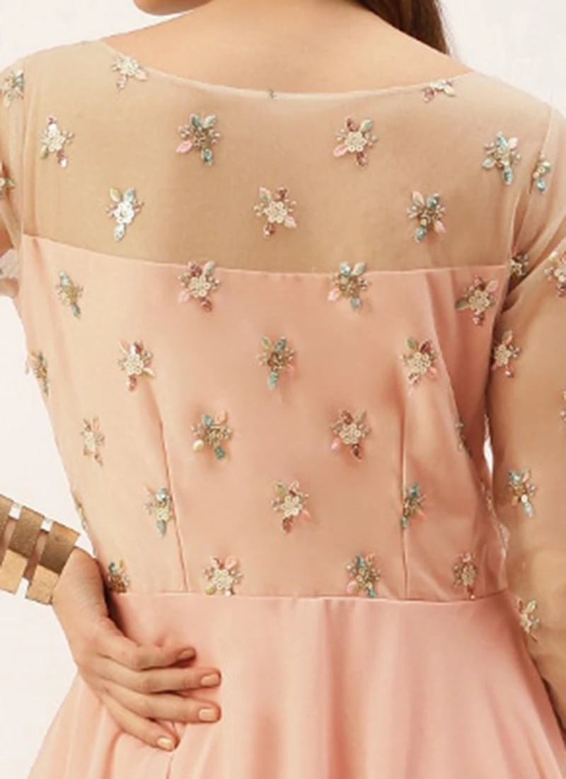 Presenting a layered gown features a white net embroidered yoke with a high transparent sweetheart neckline in the front and a high transparent neckline in the back, transparent three-fourth sleeves, natural waist length yoke, followed by pink georgette 2 layers of full circular flare where 1st layer is an asymmetrical with high on the thigh and low on the ankle and 2nd layer is full circular floor length and comes with side zip closure..