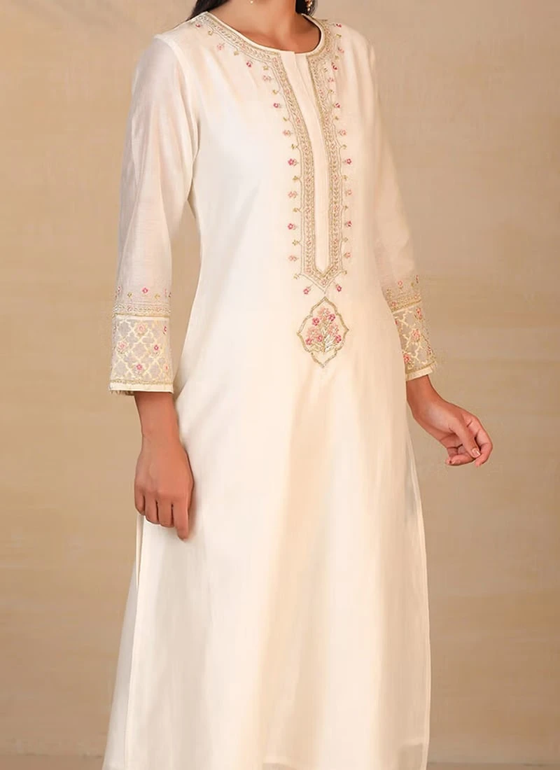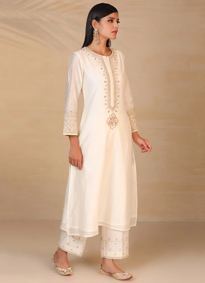 • Cream Cotton Silk Embroidered Kurta Churidar Set After Six Wear -ZariGrace Shop white cotton silk embroidered kurta churidar set krsjiw11 l