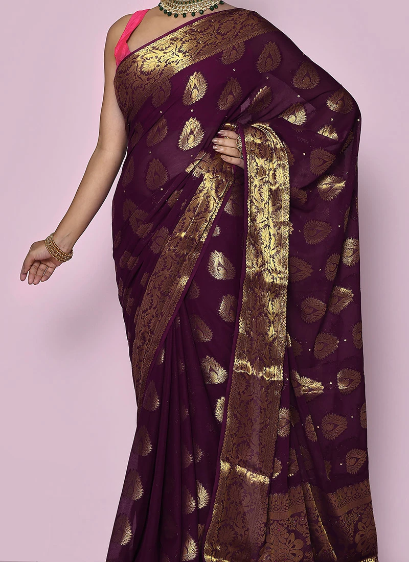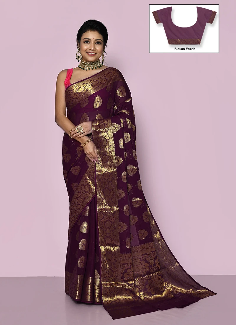 Wine Color Zari Shiffon Silk Saree Festive Wear