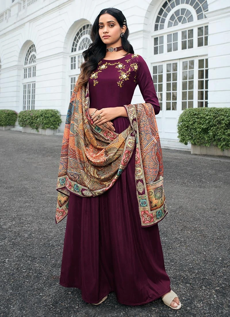 Wine Viscose Masleen Embroidered N Sequins Anarkali Suit Party Wear