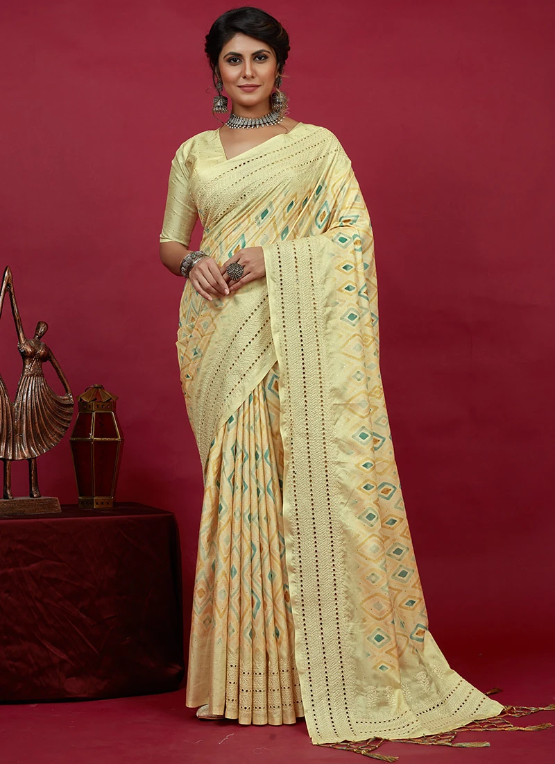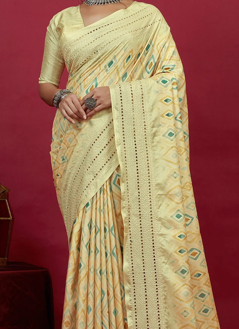In conclusion the Yellow Art Silk Cotton Printed Chikankari Sari is a true embodiment of Indian craftsmanship and culture. Its blend of art silk and cotton vibrant yellow colour intricate Chikankari embroidery and timeless design make it a coveted piece for those who appreciate the beauty of traditional Indian clothing. This sari is not just a garment its a work of art that celebrates the rich tapestry of Indian heritage and adds a touch of grace and elegance to every occasion.