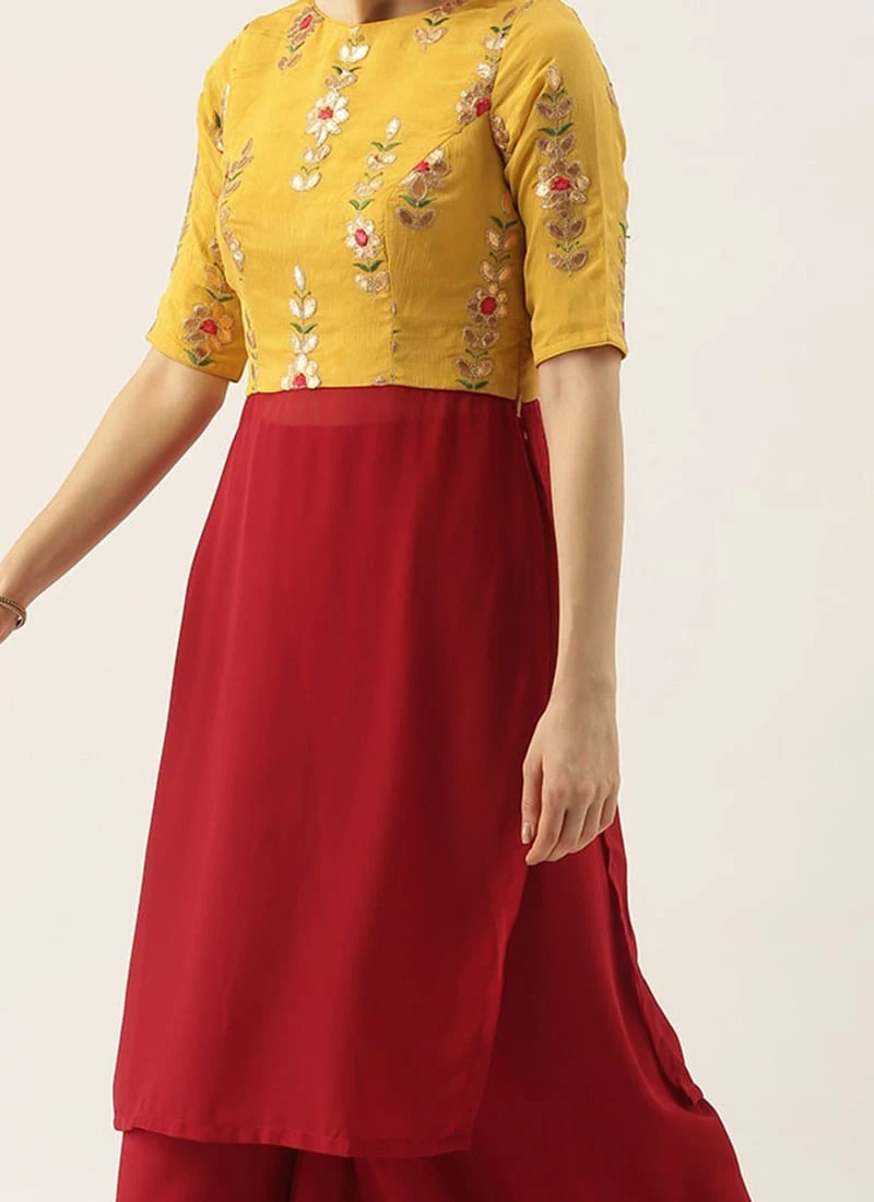 Yellow Embroidered Chinon N Maroon Top Festive Wear