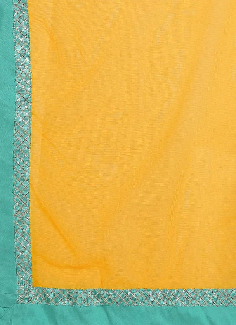 Presenting a yellow and turquoise contrast half and half saree, the blouse has a yellow cotton embroidered fabric with normal wide round neckline and front and patterned back, cap sleeve, under bust length, back hook opening, pair up with half and half saree, pleat part will be plain yellow georgette and pallu part is plain yellow net, it has turquoise embellished border with turquoise taffeta 1.5″ patti on the edges of saree..