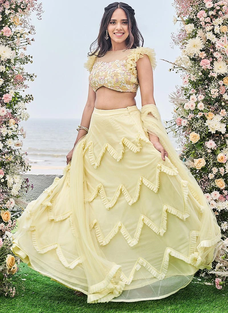 Comes with semi -stitched lehenga, un stitched choli and dupatta fabric. To have it stitched, please select the custom tailoring options. Lehenga with elaborate patterns and colors are used for photo-shoot. Color and pattern of the lehenga might not be as shown in the image.