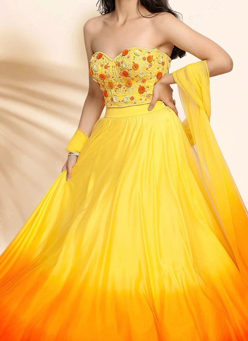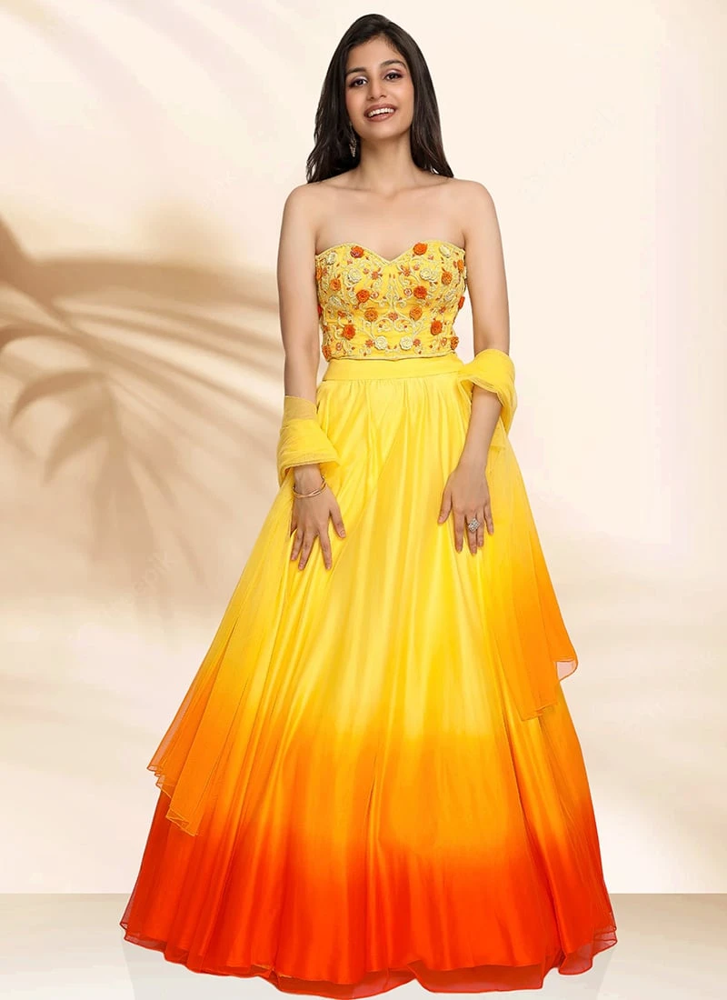 Comes with semi -stitched lehenga, un stitched choli and dupatta fabric. To have it stitched, please select the custom tailoring options. Lehenga with elaborate patterns and colors are used for photo-shoot. Color and pattern of the lehenga might not be as shown in the image.