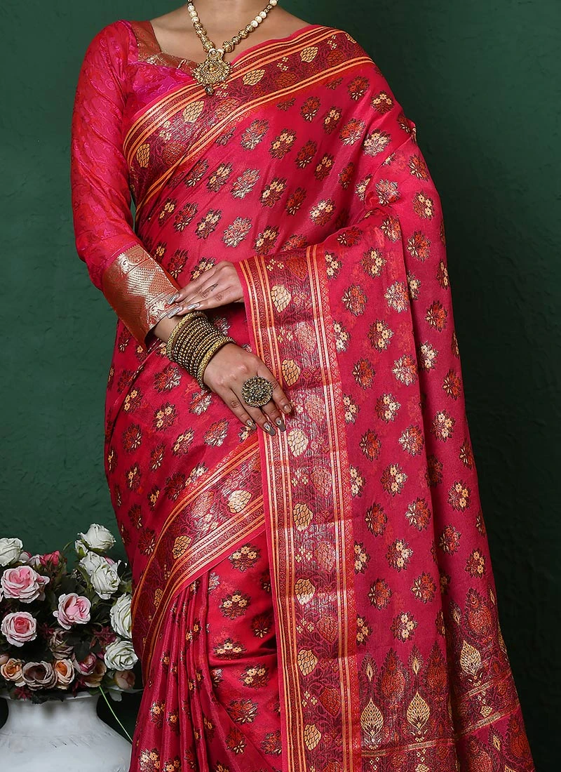 Zari Work Strawberry Red Color Pure Silk Chiffon Georgette Saree Festive Wear